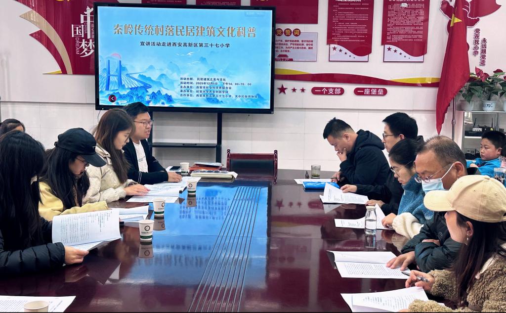 为深入挖掘秦岭传统村落民居建筑文化价值,推动优秀传统文化的保护、传承与普及,12月5日,艺术与设计学院刘义老师及其团队承担的西安市社会科学界联合会2025年“走读秦岭”社科普及宣讲项目走进西安高新区第三十七小学,为该校师生带来了一场内容丰富、形式生动的秦岭传统民居建筑文化科普盛宴。