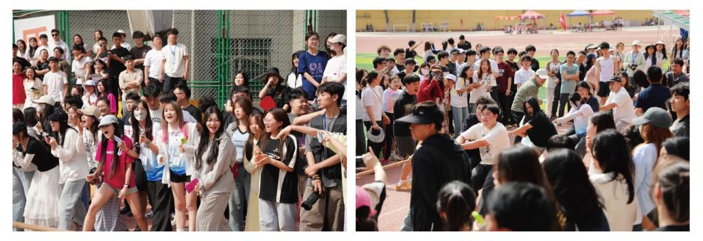 拔河赛场上,气氛热烈非凡。艺术与设计学院队员双脚蹬地,身体后仰,拼尽全力往后拽绳。绳索中间的红绸带左右摇摆,牵动着所有人的心。观众们呐喊助威,声浪震天。这是一场力量与团结的较量,每一份坚持都闪耀着热血的光芒。同学们在这次比赛中有获得两轮胜利的激动和喜悦,也有未能夺冠的遗憾。希望在这股热血力量的映衬下,我们学院会变得更加齐心聚力,努力奋进。